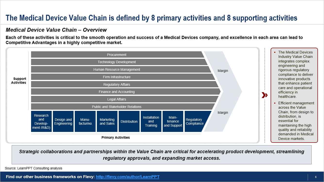 The Medical Device industry is integral to healthcare, offering a diverse array of innovative devices that enhance patient care. With an aging population and technological advances, the medical device market is set to hit $612 billion by 2025. Ensuring a robust value chain, from R&D to compliance, is essential for delivering quality products and maintaining market success. Companies focus on efficiency, innovation, and strict adherence to regulatory standards for competitiveness. Innovations such as AI, 3D printing, and wearable technology drive industry growth, while companies must stay agile to adapt to ongoing regulatory and market changes. Discover strategies for extensive value creation and learn about customizing operations for the Medical Device sector through a detailed value chain analysis and insights into continuous innovation and regulatory compliance.